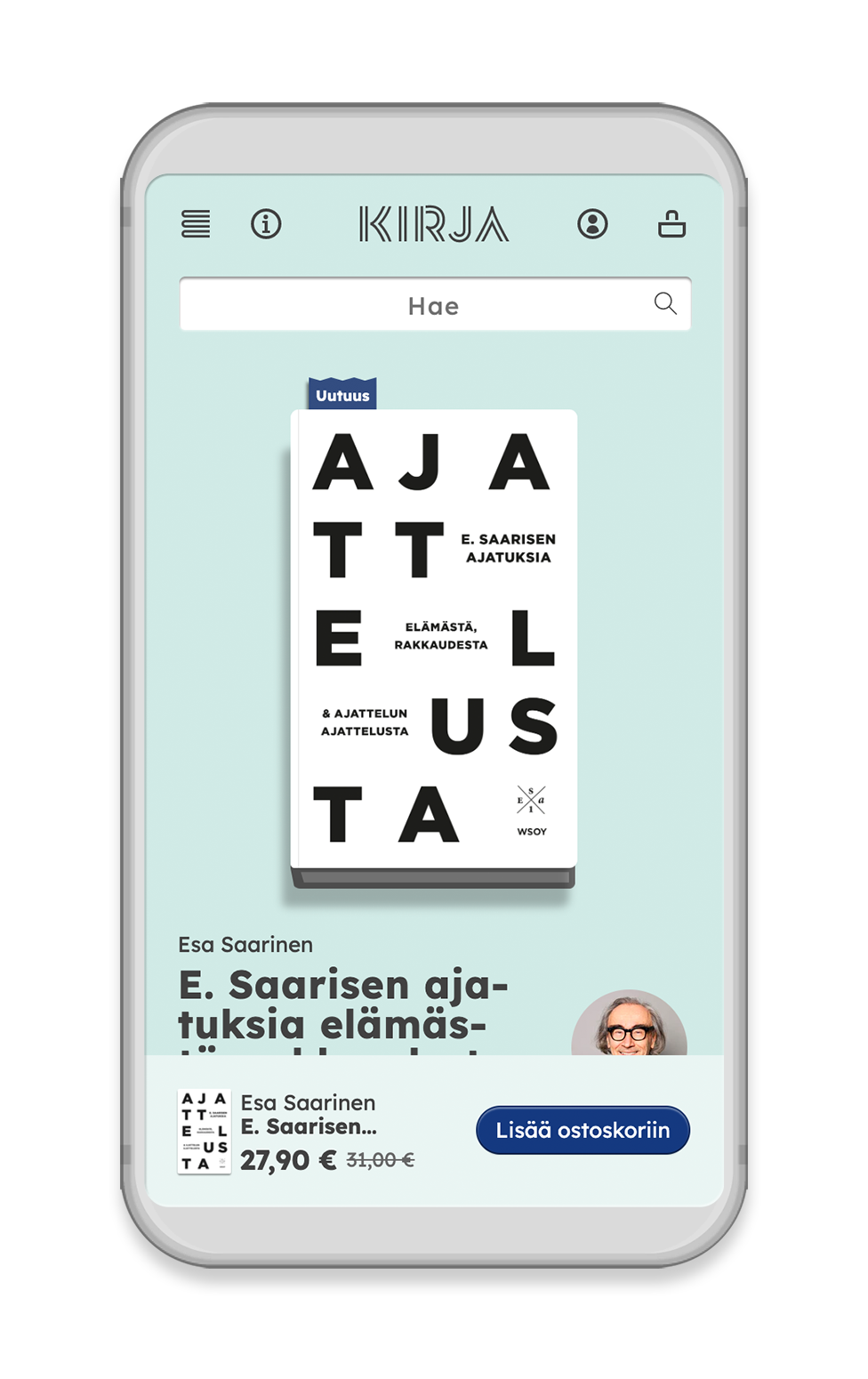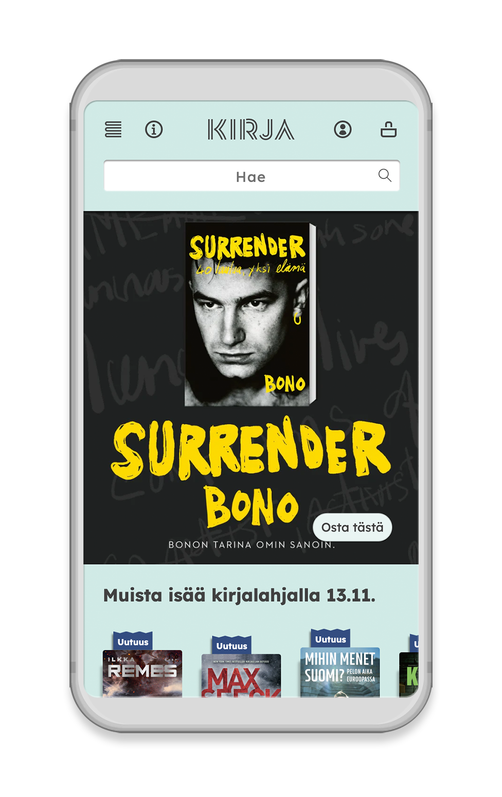 Kirja.fi ('Book') is a webstore for the largest publisher of books in Finland, Werner Söderström Oy. Even with audiobooks gaining in popularity, the physical book can still more than hold its own. The design accordingly highlights the physical nature of books.