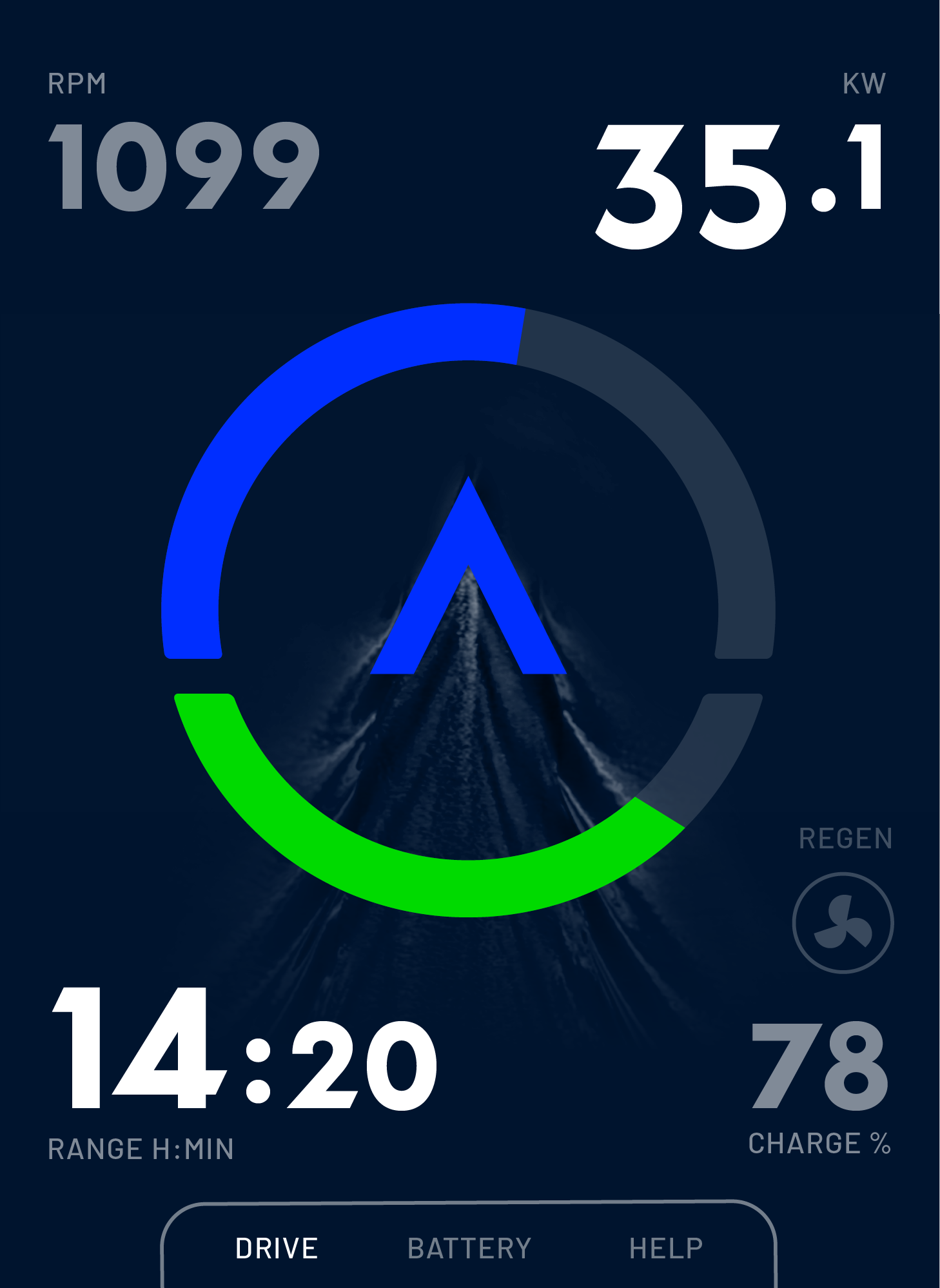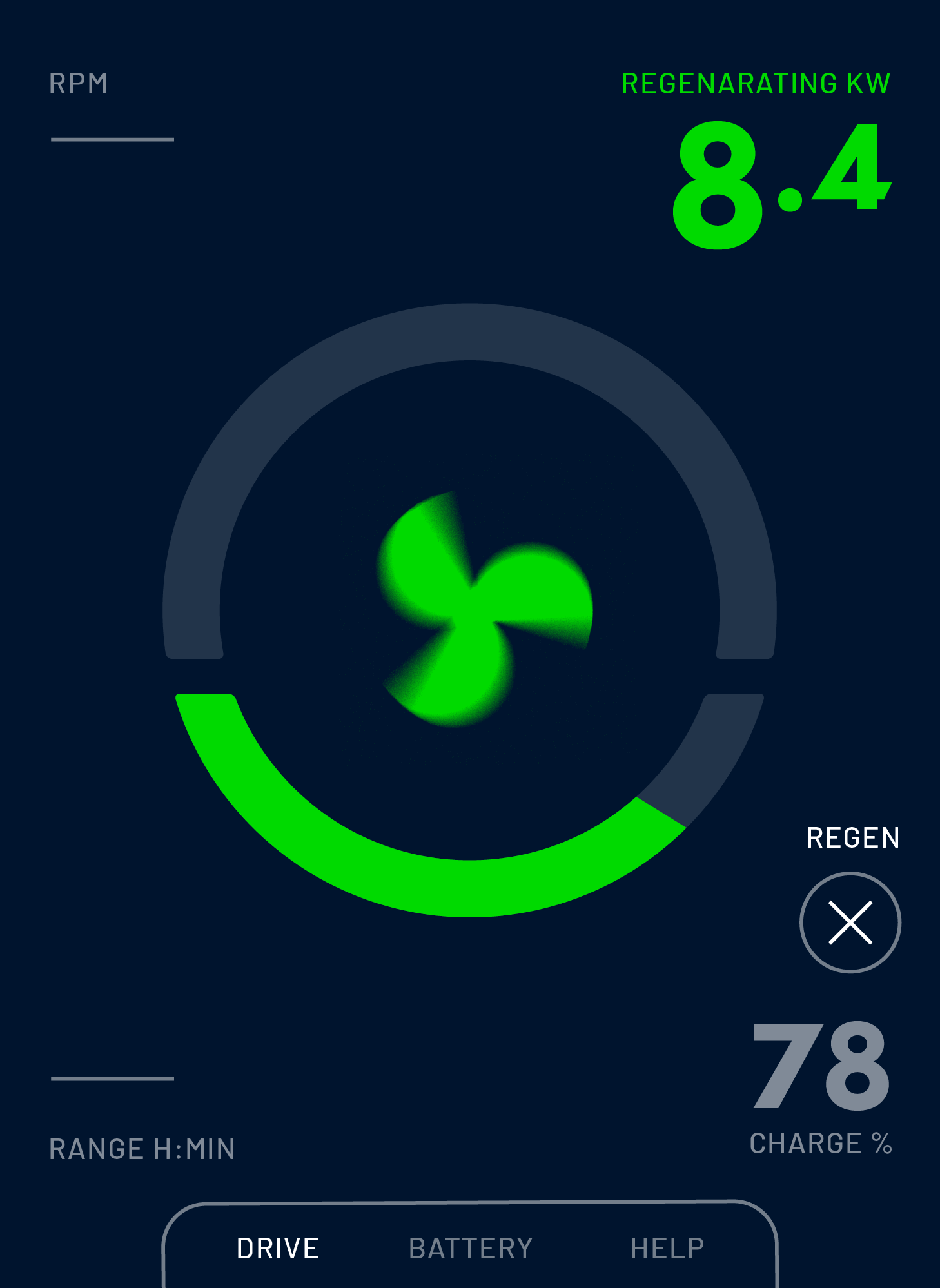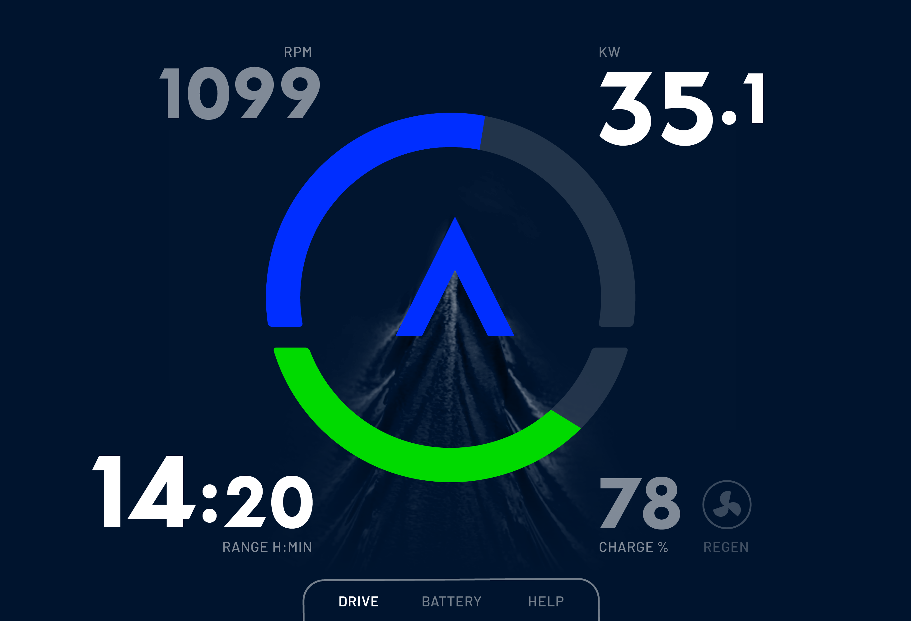 The dashboard interface was built around Oceanvolt’s logo, brand colours and typograpgy. It was also enriched with subtle animations. The motor can also run in reverse, which is showcased in the animation.Key information had to be clearly visible even under challenging conditions, which are common when sailing.The interface had to be able to clearly show warnings.Regeneration is Oceanvolt’s unique technology for rechargig the batteries when sailing on wind alone.In the idle state, the interface is clearly different from when the motors are enganged.Loss of battery connection is also a possible issue that needed to be indicated.The dashboard had to also adapt to configurations with two independently controlled motors.The touchscreen was shared with other functions, such as a navigation plotter. The default interface occupied half of the screen, but the design had to adapt to a wider view as well.The design had to be adapted to all possible permutations of available screen area and motor configurations.In addition to the main drive functions, the dashboard also offered functions for checking the battery status, help and system information.