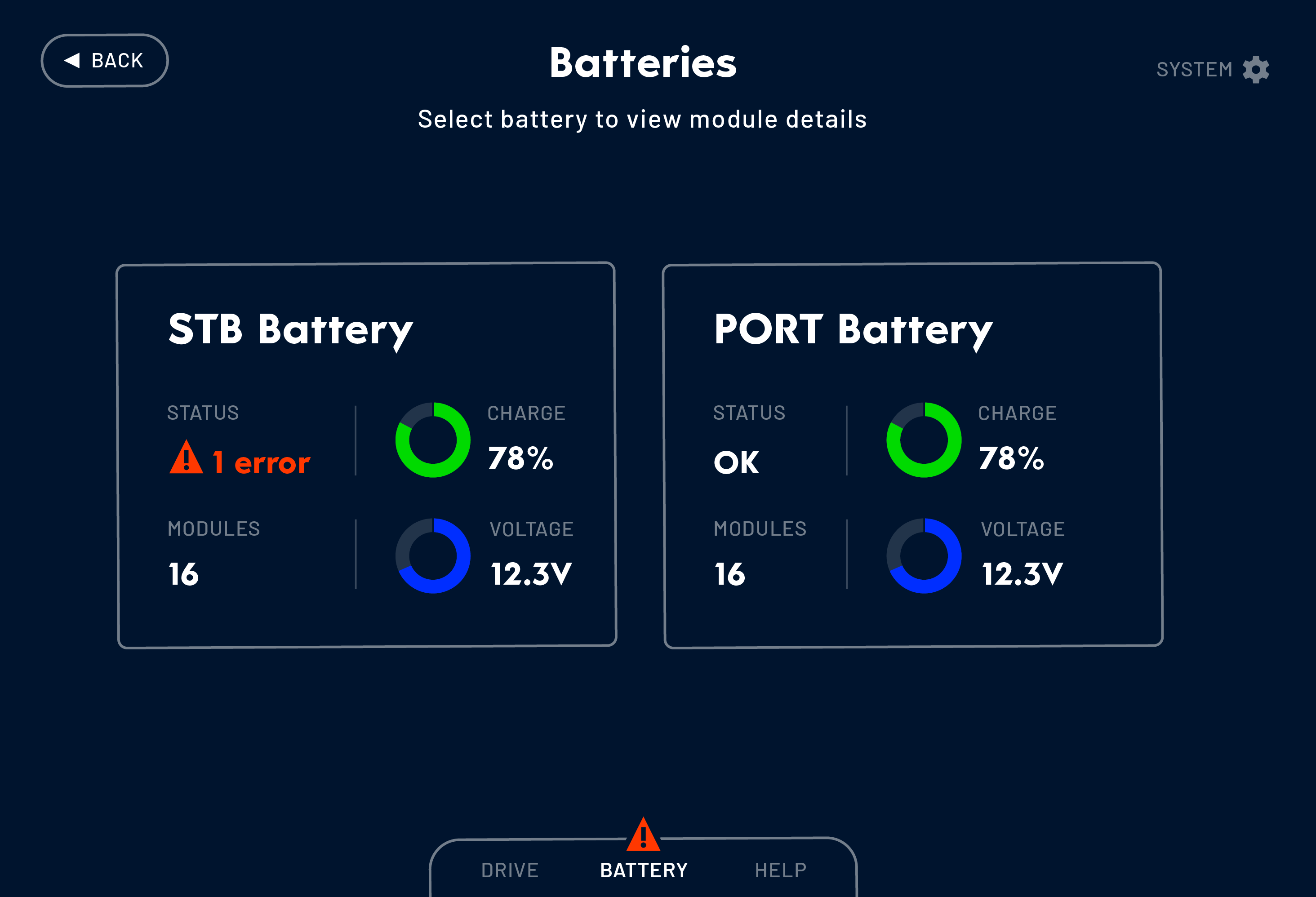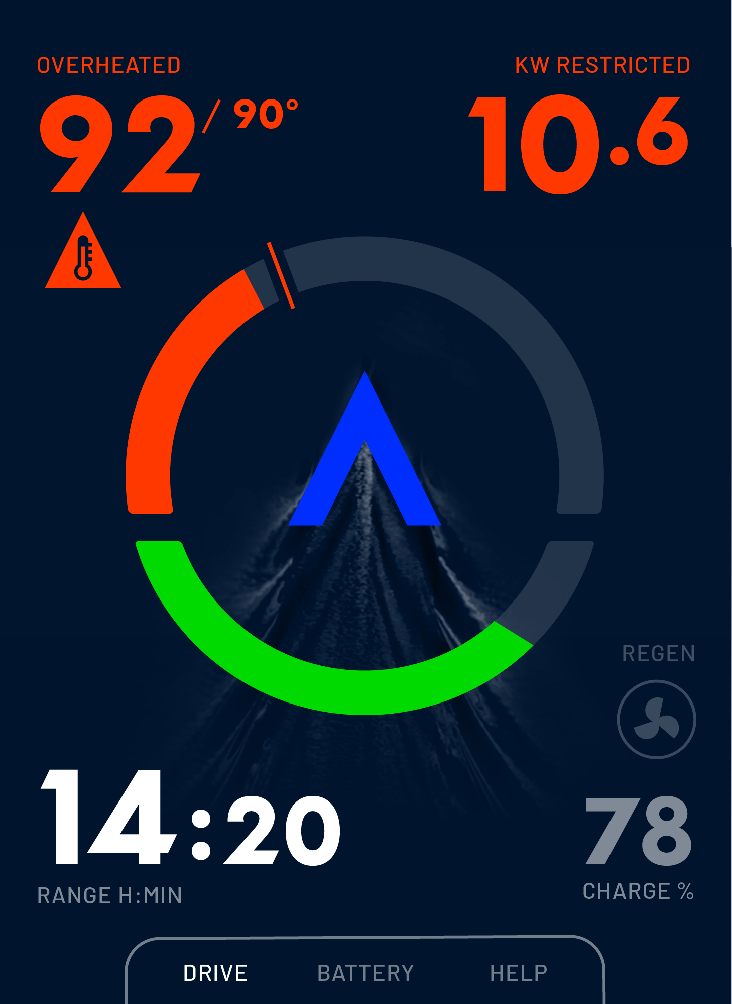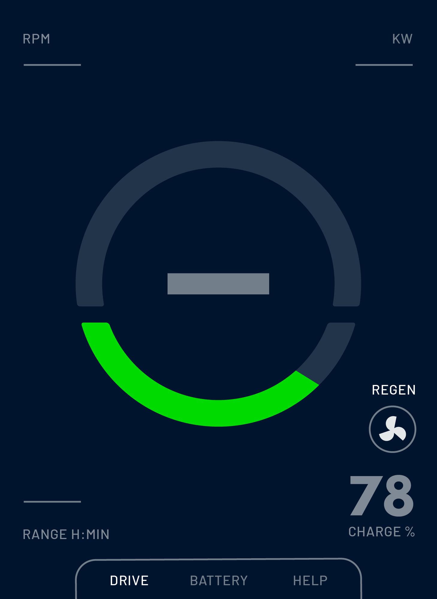 The dashboard interface was built around Oceanvolt’s logo, brand colours and typograpgy. It was also enriched with subtle animations. The motor can also run in reverse, which is showcased in the animation.Key information had to be clearly visible even under challenging conditions, which are common when sailing.The interface had to be able to clearly show warnings.Regeneration is Oceanvolt’s unique technology for rechargig the batteries when sailing on wind alone.In the idle state, the interface is clearly different from when the motors are enganged.Loss of battery connection is also a possible issue that needed to be indicated.The dashboard had to also adapt to configurations with two independently controlled motors.The touchscreen was shared with other functions, such as a navigation plotter. The default interface occupied half of the screen, but the design had to adapt to a wider view as well.The design had to be adapted to all possible permutations of available screen area and motor configurations.In addition to the main drive functions, the dashboard also offered functions for checking the battery status, help and system information.