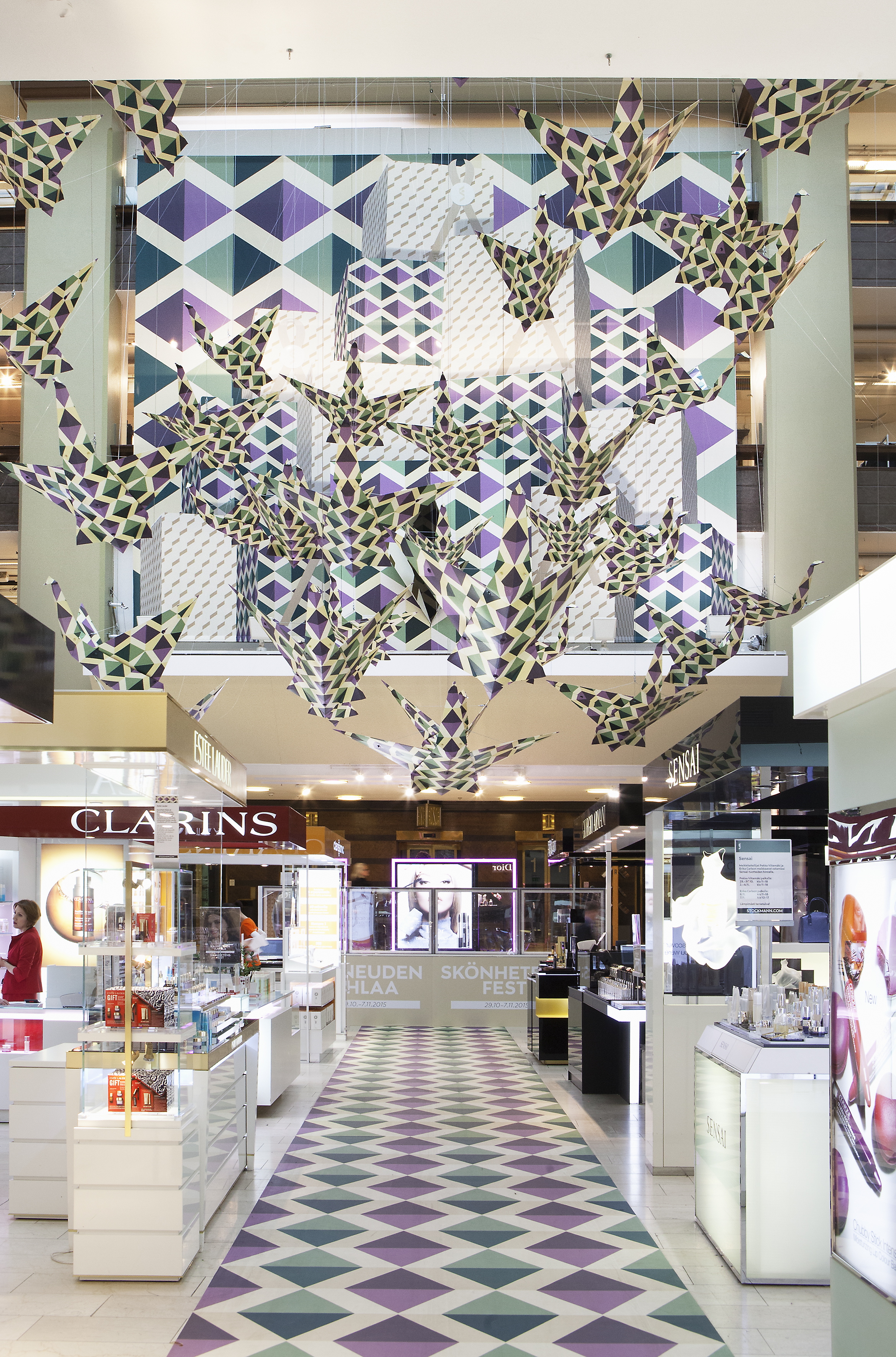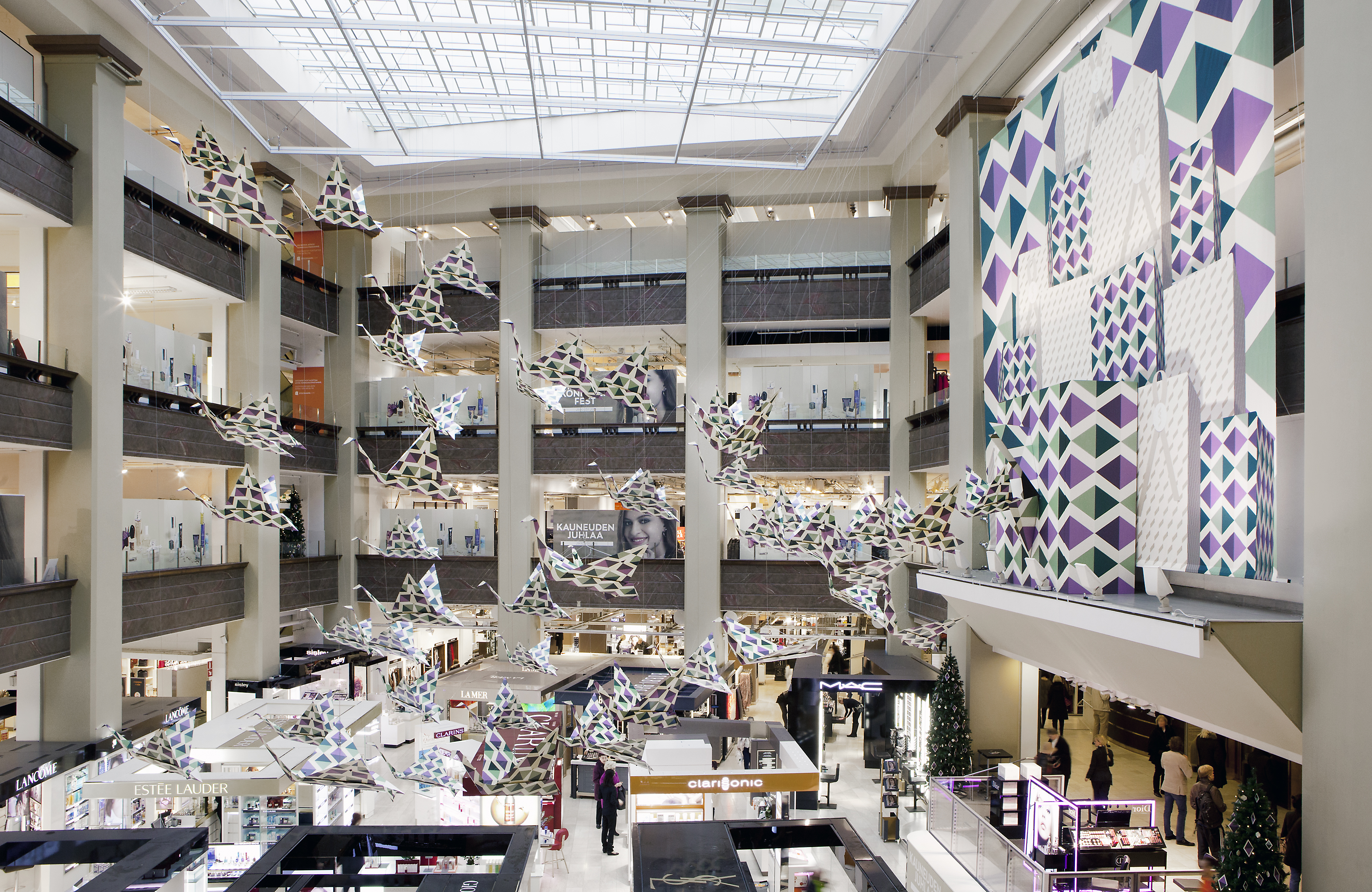 Dubbed Yuligami, the installation crowded the hall with a siege of origami cranes showcasing the new wrapping paper. The bespoke crane was designed by Finnish origami artist Sirkka Huttunen, who also held workshops for Stockmann’s customers.